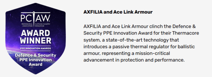 Ace Link Armor, in collaboration with AXFILIA, has been honored with the Defence & Security PPE Innovation Award by PCIAW – the Professional Clothing Industry Association Worldwide. The award was presented as part of the PPE Innovation Awards, recognizing Thermacore® as a breakthrough technology in the field of ballistic protection and wearer comfort.